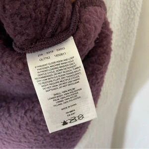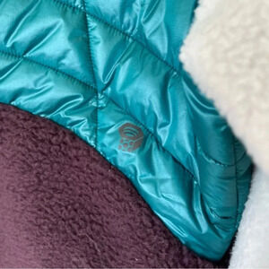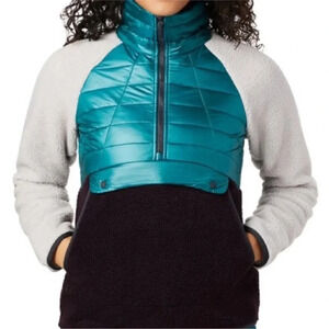 Mountain Hardwear's pullover jacket offers insulation that's styled for optimal comfort. Combining an ultralight ripstop shell and baffled synthetic insulation at the chest with soft, high-loft Sherpa fleece at the arms, back and lower body. Half-zip design trimmed with a stand-up collar, elastic trim and zippered pass-through handwarmer pockets with a snap-flap pouch pocket.
