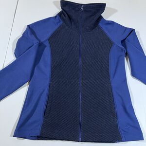 This listing is for a women's size small Mountain Hardwear full zip fleece jacket. Pre-owned, in good condition. No rips or tears. Some pilling in the darker blue area. No stains. Please see photos for details.