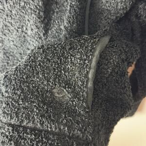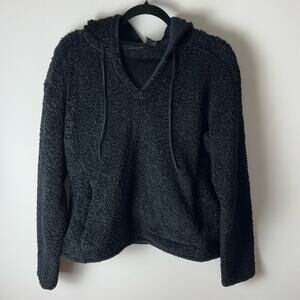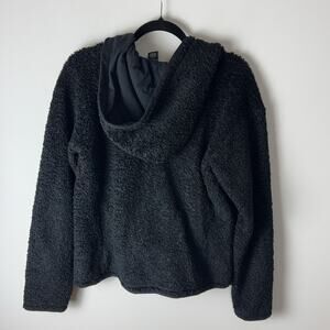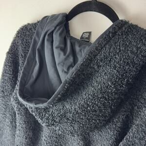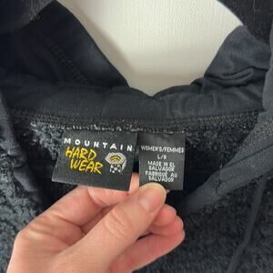 Gently Used Mountain Hardwear Hoodie Sweatshirt. This is a women's large. Dark black throughout. A fuzzy sherpa type fleece exterior. Front pockets. Bit of a v-neck. Super comfy and warm! 100% polyester.