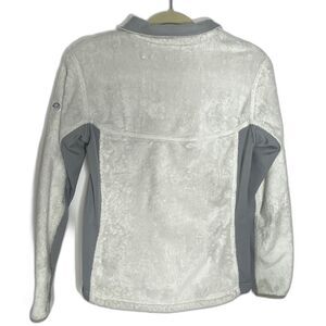 Wrap yourself in ultra-soft warmth with this Mountain Hardwear Pyxis fleece jacket. With a cozy furry texture in white and grey tones, it's ideal for hiking, lounging, or layering. Techwear meets comfort in this versatile piece. Light discoloration on zipper pull (see pic). A cold-weather essential.