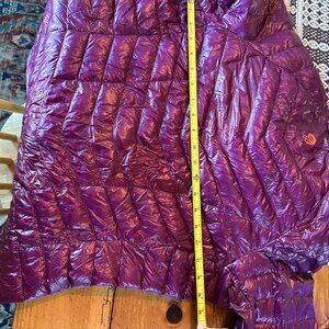 Warm, ultralight Mountain Hardwear down-insulated jacket in a fun purple exterior with bright orange lining and accents. Pretty sure this is an old version of the Ghost Whisperer UL design. Designed for hiking, climbing, travel, and everyday layering — incredibly warm for its weight, compressible, and easy to pack.