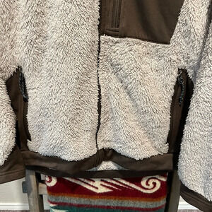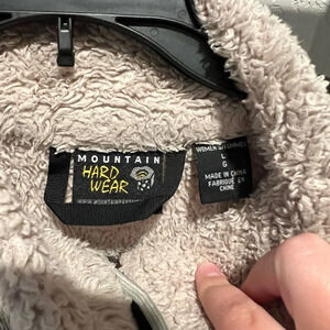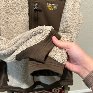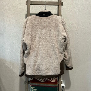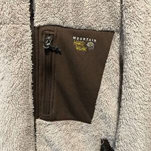 EUC Mountain Hardwear women’s Polartec high loft jacket size Large. This jacket is perfect for the upcoming cooler weather! I believe this is the wild oyster colorway with black and brown accents! Front zipper pockets!