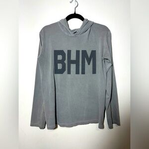 Stylish gray hoodie with bold BHM lettering. Comfortable and casual.