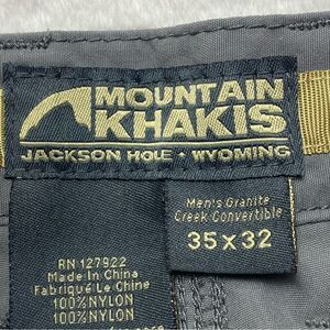 Mountain Khaki Jackson Hole Wyoming Gray Convertible Cargo Pants Size 35. Great used condition. Zip off bottom legs. Zipper at cuffs. 100% nylon. Multiple pockets. A couple spots at cuffs as shown in photo. Measures waist 34", inseam 31.5", rise 10".