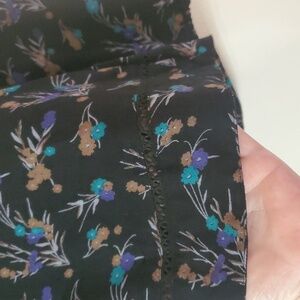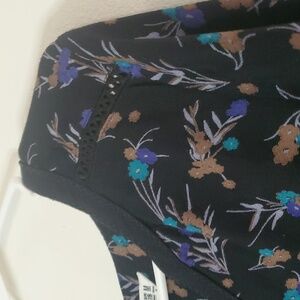 Womens floral blouse top size medium. Panels throughout that show the skin. Great pre-owned condition. Approximate measurements provided. Modest. Feminine. Resortwear. Preppy. Classy. Dark Moody Floral. Coastal. Flowy. Western. Equestrian. Business Casual. Office.
