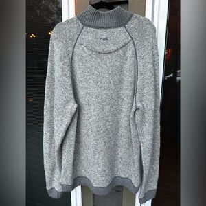 Cozy heather gray pullover with a quarter-zip design. Features a ribbed collar and textured knit pattern.