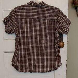 Stylish plaid design. Short sleeves. Button-down front. Perfect for casual wear.
