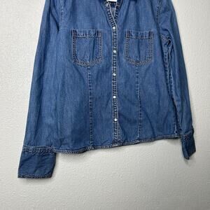 Mountain Lake denim snap-front shirt in blue, women’s size medium. Made from 100% cotton for a soft, breathable feel. Features long sleeves, a classic collar, chest pocket, and snap-button front closure. Perfect for layering or casual everyday wear.