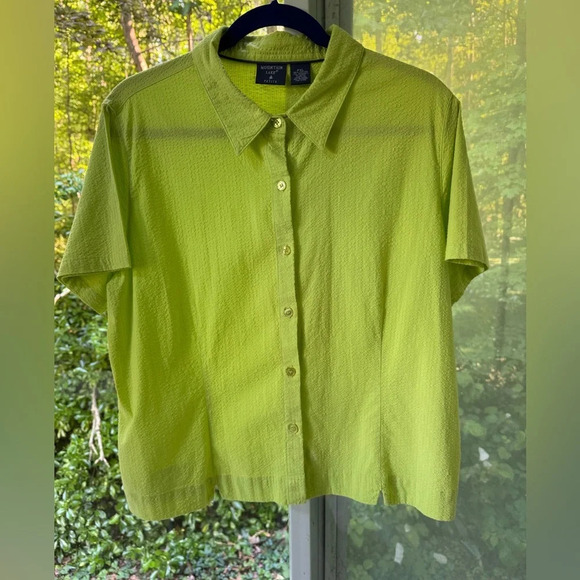 Mountain Lake PXL Chartreuse Seersucker s/s button front collared women’s shirt