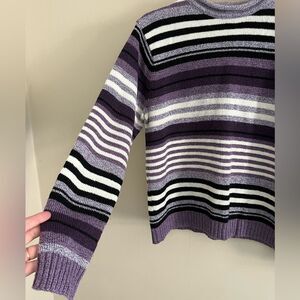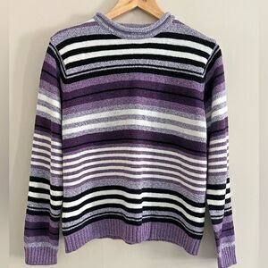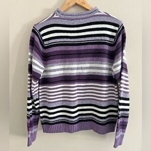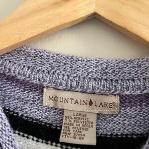 Cozy up in vintage vibes with this Mountain Lake striped knit sweater featuring bold horizontal stripes in lavender, black, ivory, and deep purple tones. A classic piece with a retro twist, perfect for cool weather layering.