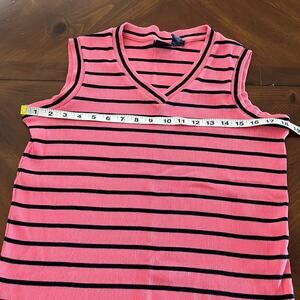 Pink and black striped ribbed cotton blend knit top with v-neck, sleeveless