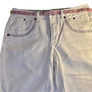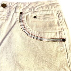 Mountain Lake White with Rainbow Trim Cuffed Hem 6-Pocket Denim Shorts Size 10. These shorts are preowned and in very good condition.