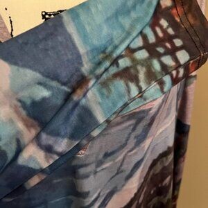 Mountain-Scene Top - Size Medium. Collar. V-Neck. Long Sleeves. 100% polyester. Never worn. Excellent condition. Multicolored with silver, blues, browns, reds, purples. Pit to pit is 22 inches. Length from the top of the shoulder to the bottom of the garment is 25 inches. All measurements are approximate.