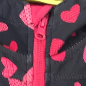 Very cute girls coat jacket by Mountain Warehouse. Features navy with all over pink heart design. Has zip front and long sleeves. Two front pockets and two inside pockets. Very nice preloved coat. Girl's size 9-10. Size Nine. Size 10.