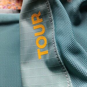 EXCELLENT condition, like new. The Mountainsmit Tour Lumbar pack is thoughfully designed for comfortable carrying. This pack is better than the newer one because it is a more manageable size and has an outside area that can secure a light jacket. The pack can even hold a large book. NOTE: The teal is a light teal, NOT bright. It looks different in different lighting. VERY comfortable!