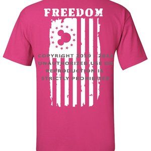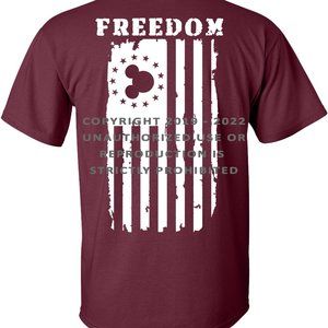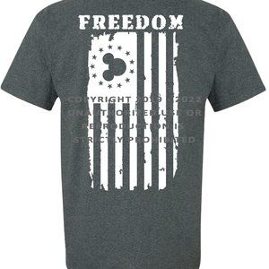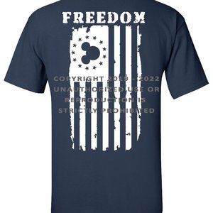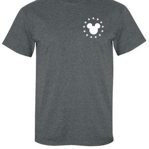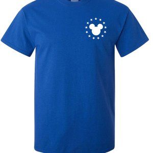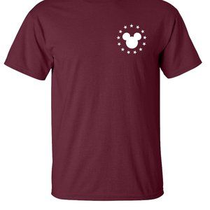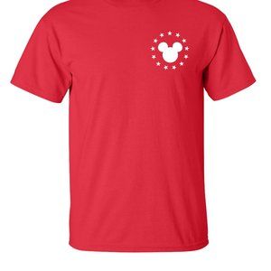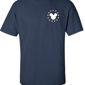 This is a one of a kind shirt designed and made by us - Designed in the USA and Made in the USA. This unique design featuring Mouse Ears on the front with 13 stars representing the first 13 colonies. On the back is a distressed American flag with Mouse Ears and the 13 Colonies Stars imposed in the stars field. This is a must have shirt. NOTE: This is our original design. If it is not sold by The Disney Nation™ it is not an original and violates our copyright.