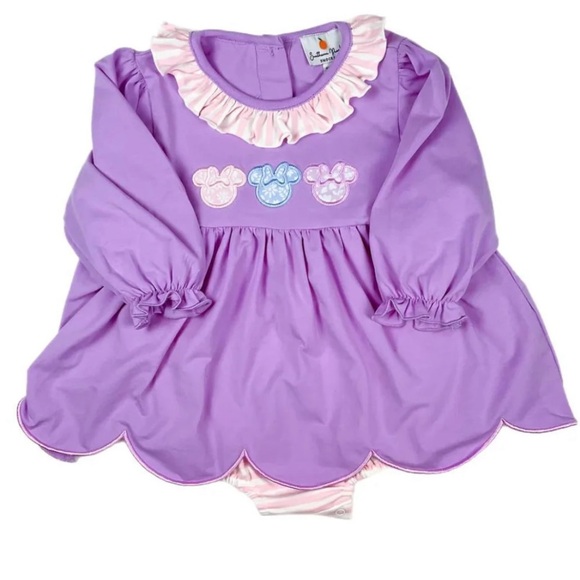 Adorable purple kids one piece with ruffled details and playful accents. Perfect for a fun day out.