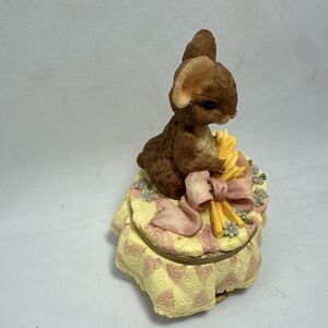 This charming music box features a delightful melody and a cute bunny rabbit design. It is a perfect addition to any collection of decorative collectibles, and comes with a certificate of authenticity for added peace of mind. The box is made by Heritage House and was manufactured in China, with a SKU number of HMEK0235173.Melodies Country Fair is a wonderful addition to any music box collection, and is sure to bring joy to all who hear it.