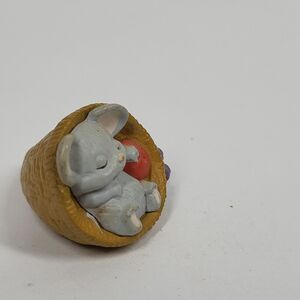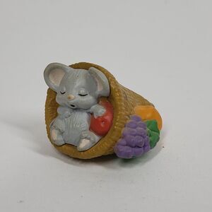 Vintage figurine of a mouse sleeping in a cornucopia. Made by Hallmark, dated 1988. This tiny figurine is about 1 tall. Good shape overall with some surface wear from handling.
