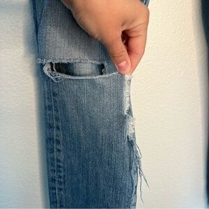 Pre-owned with staining and minor puckering. Additionally, the rip is ripped more than intended. Please review photos