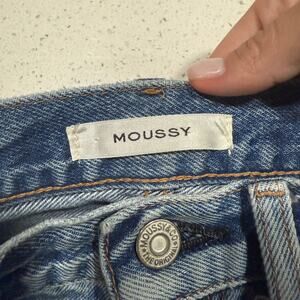 Moussy Odessa Straight Leg Distressed Jeans in Blue. Size 26. Features high waisted / hi rise, straight leg, loose fit throughout, distress detail on knees, mid wash, zipper fly, belt loops, pockets. 100% cotton. Rip extending from knee. Style 010CSS11-0190. Retail $370. Always received tons of compliments!