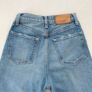 100% cotton denim jeans. Zipper fly, button closure, 5-pocket style. Fitted through waist and thighs with slight flare. Medium blue wash with some fading.