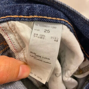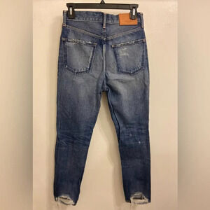 Moussy Vintage High Rise Straight Leg Distressed Jeans Blue Size 25. Good pre-owned condition. No flaws. There is additional distressing in the knee-looks like it has ripped a little more.