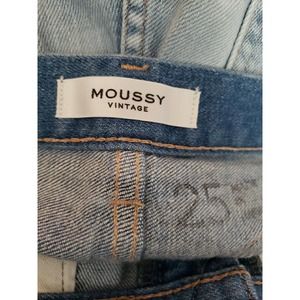 MOUSSY VINTAGE cuts their Lenwood jeans for a slim fit in their distressed light wash denim. Belt loops. Zip fly and button closure. Five pocket styling Fit information: * High-rise * Cropped skinny silhouette * Stretch denim Style Number: 025ESC12-2480 LENWOOD Details: * Fabric: 95% cotton, 4% polyester, 1% spandex * Combo: 100% cowhide leather * Machine wash cold * Made in Japan Excellent pre-owned condition! 27" inseam 9.5" rise 15" Waist laid flat across