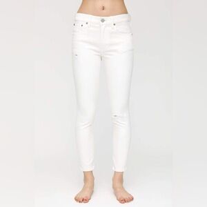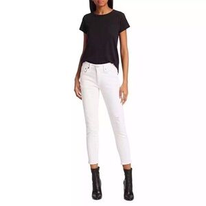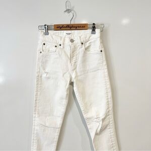 Subtly distressed optic-white skinnies cut from premium Japanese denim are softened with a whisper of stretch. Zip fly with button closure. Five-pocket style.