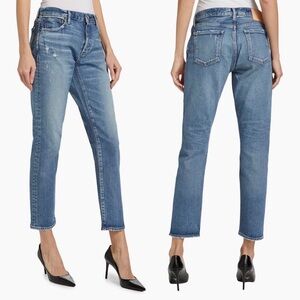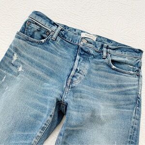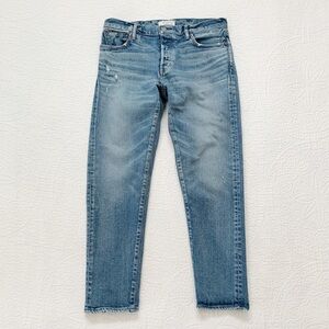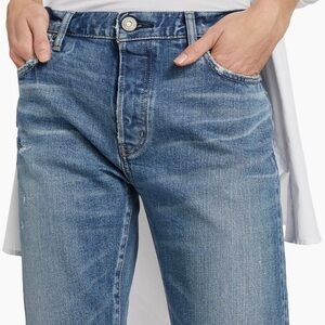Extremely well crafted, made in Japan. Mid-rise denim jeans with slightly tapered fit. 5-pocket styling, button fly. Medium blue wash with fading and distressing.