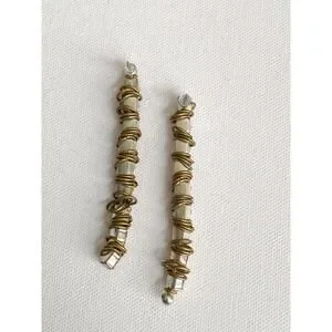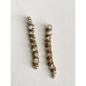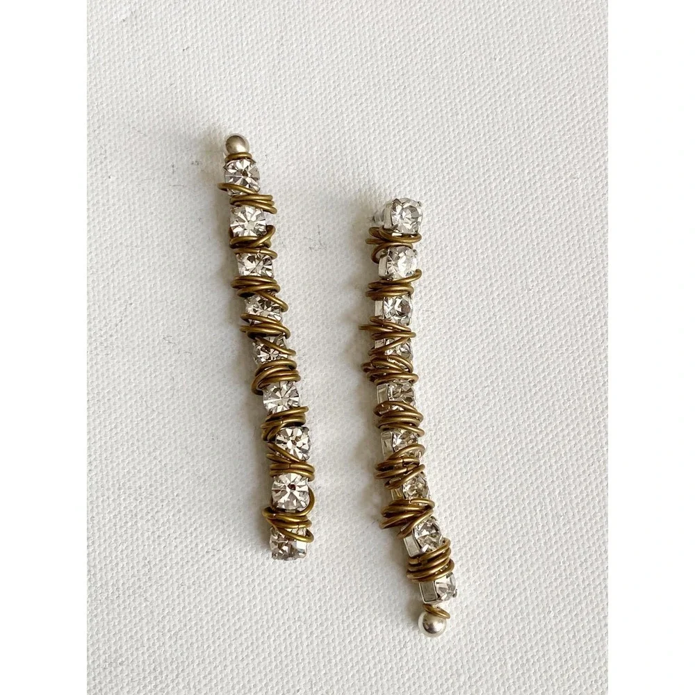 Silver plated linear earrings with gold plated ring and Swarovski crystal accents. Post backs for pierced ears. 3" long