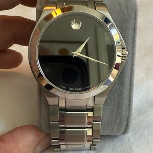 Lowest price will not sell cheaper! Sleek Movado watch with a black dial. Silver bracelet adds elegance. Just needs new battery :)