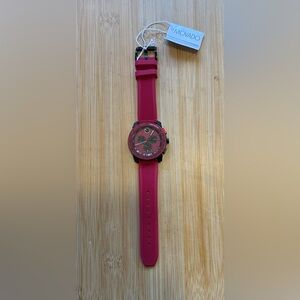 Enjoy Sporty Looking Casual Luxury Movado Bold TR90 Watch 3601215 With 43.5mm With Black & Dark Red Chronograph Face Face With 3 Black SubDials & Movado Moon at 12 O' ClockHourmarkers Position & Black & White Hands & Black HourMarkers & Date Window & Dark Red Silicon Band. Its Original Retail Price is $695 & Overheads Enjoy This Great Looking Timepiece At Great Discount price.