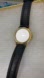 Elegant Movado watch with a gold case. Black dial and leather strap. Minimalist design.