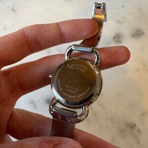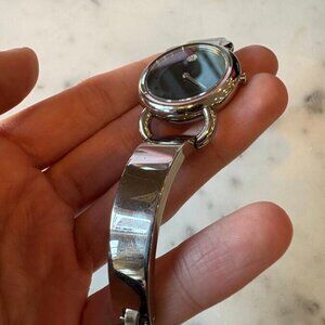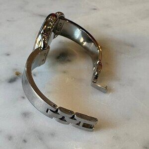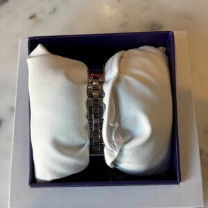Polished stainless steel bangle bracelet secures with a fold-over clasp