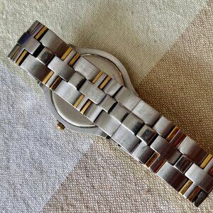 In this classic style, this watch is paired a 40mm case with a yellow gold PVD finish to a stunning deep black mother-of-pearl dial and a two-tone bracelet of stainless steel and yellow gold PVD. The signature dot and slender hands are cast in yellow gold PVD for a flawless finish. Double-fold clasp.