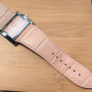 Elegant Movado watch featuring a pink dial and a light pink leather strap. Perfect for any occasion.