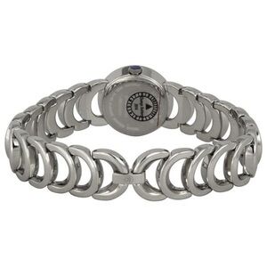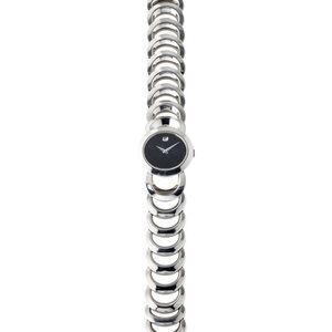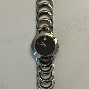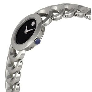 Elegant Movado women's watch featuring a sleek silver bracelet and a striking black dial. Perfect for any occasion.