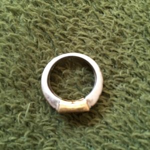 Sterling silver and 18k gold, heavy and thick, as you can see from photos. Whenever I wore it, people thought I had gotten engaged, because the gold in the center shines so bright. It's a great piece, I wore it alot so there are some scratches on the gold.