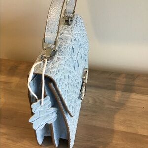 This stylish Movdari handbag features a unique crocodile embossed design in a chic blue color. The silver hardware and elegant magnetic closure with a beautiful bee with pearl wings and red stones adds a touch of elegance to any outfit. Silver crossbody chain included and It also has a matching bear hanging tag and dust cover.
