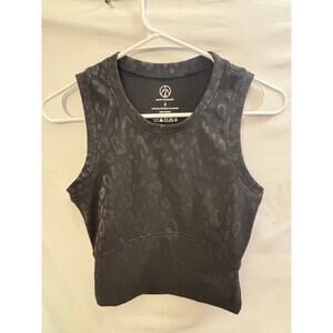 Move Theology activewear cropped tank top in subtle black leopard print. Features ribbed stretch fabric, seamless construction, and wide straps for comfort and support. Perfect for workouts, yoga, or casual athleisure looks. Size Small.
