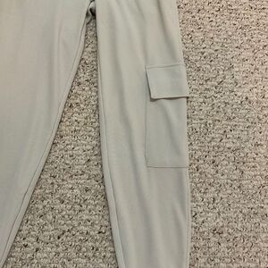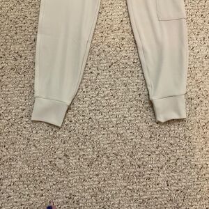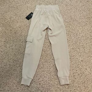 Move Theology greatest Jogger Cream Size XS, New with tags; Color: cream, ribbed, banded cuffs, wide waistband, fabric provides stretch, ankle length, jogger fit, 2 front pockets, 1 cargo pocket, high rise waist, pull on, polyester/spandex, imported, machine wash; inseam 26” see pic. Smoke free home. Fast shipping.