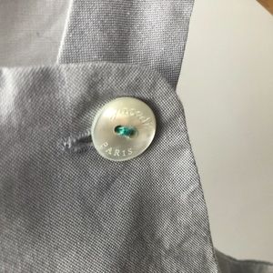 Never worn. Light blue/grey baby overalls. Snap button closures at the bottom. Two buttons on each strap to adjust for size. 6mo.