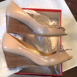 Moved Coach Paola Soft patent kid stack wedge warm blush peep toe shoes, red box