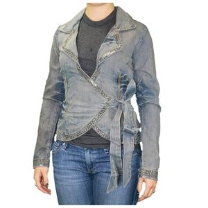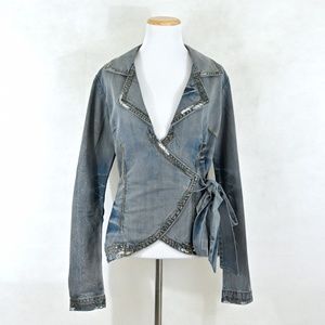 Features: Rare & unique! Retro 2000s high end designer jacket. Solid pattern design. Modern fitted style. Decorated with jean whiskers, glitter, embroidered design and embellished with metal studs. Front tie closure. V-neckline with lapels. Long sleeve. Machine washable or dry clean. Made in Thailand