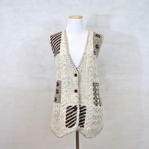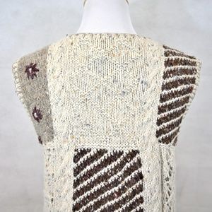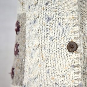 Features: Heathered pattern design with diagonal stripes & flower detail. 90s vintage hand-knitted cardigan. 4 button closure. V-neckline. Sleeveless. Hand washable. Made in China