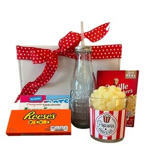 Enjoy a movie night with this gift basket featuring a reusable glass Coca Cola bottle with straw, perfect for anyone who loves the iconic brand. This basket also includes a candle, candy, and popcorn to create a cozy and fun movie viewing experience. The red color and Coca-Cola branding make it a great gift for any occasion, whether it's for kids or adults. To personalize this gift basket, simply leave your name at checkout.