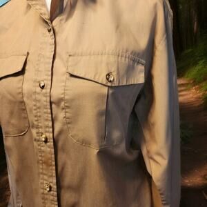 Classic and timeless style. Light tan button down Junior's top. Safari Style chest pockets. Long sleeve. Lightweight and comfortable.