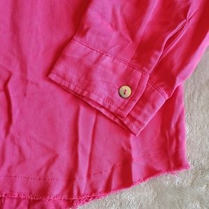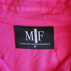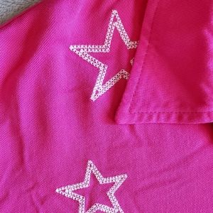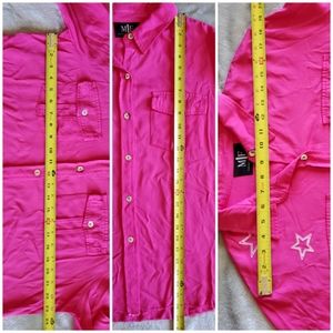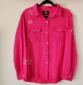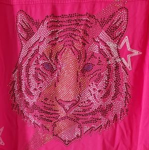 Moving Forward Designs hot pink color,Stars rhinestone face tiger Shirt, Oversized, size M, button down, bag chest, collar, long sleeves, 1 button on each sleeve, undressed hem, 70% rayon, 30% tencel, new without tag, in Excellent Condition.