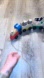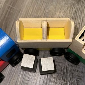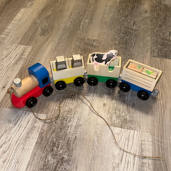 A moving train set my toddler loved but didn’t use often. I tied a string on the front for her to bring it with her, I can remove it or keep it. My toddler has drawn on some of the pieces as pictured. A very cute, moving train with 2 milk cans, 2 vegetable cans, and a cow